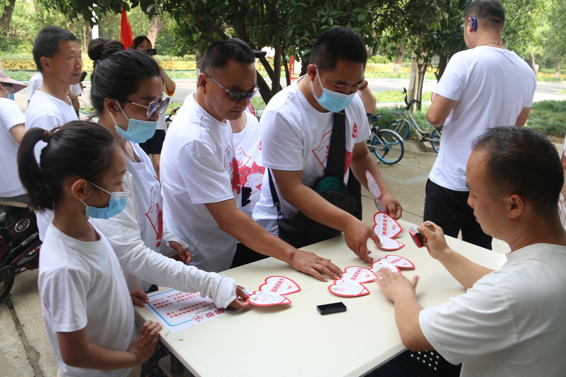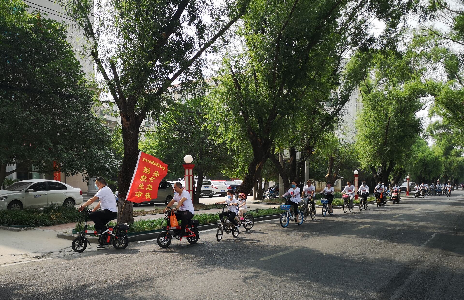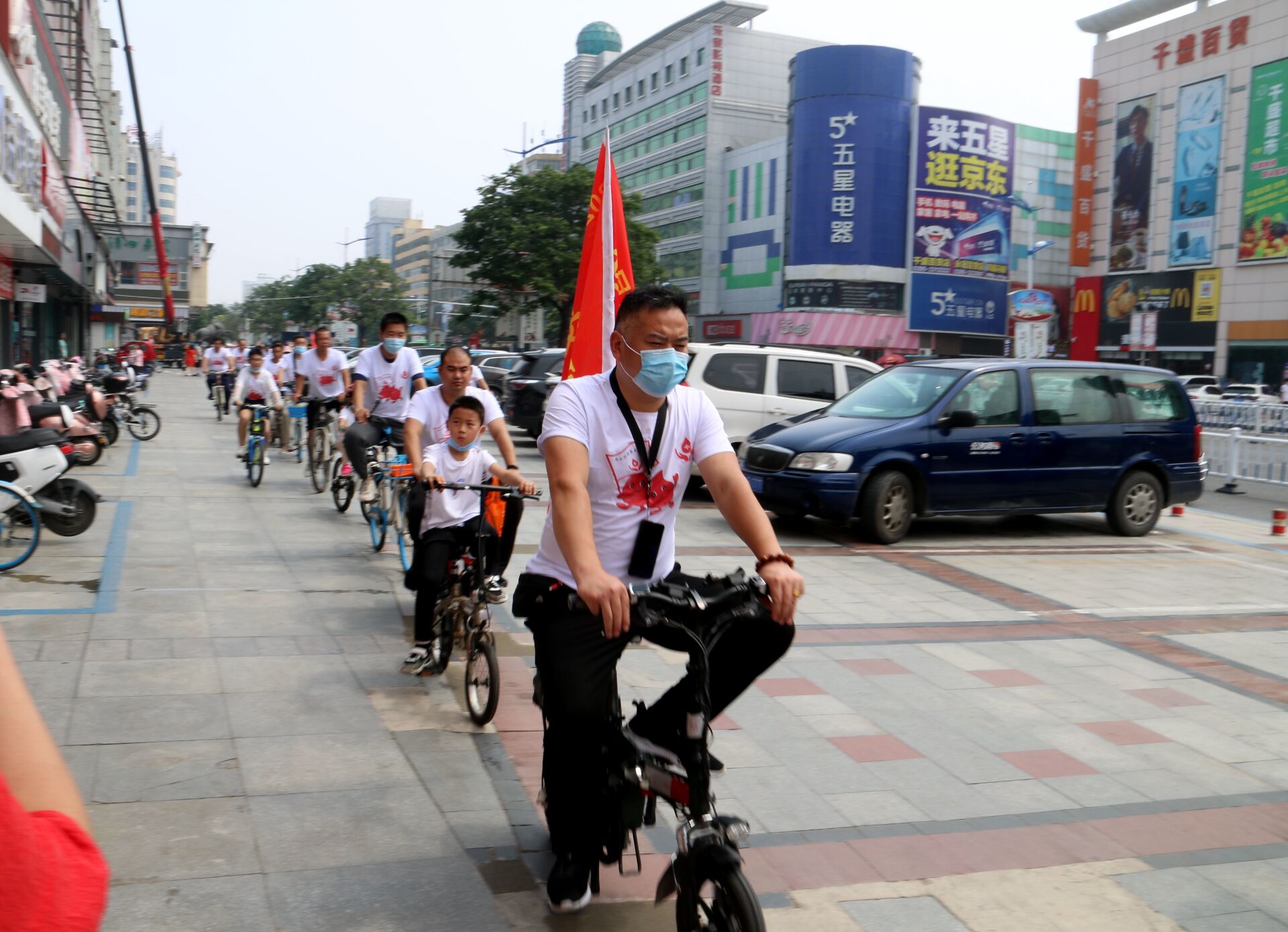 6月14日上午9時,志愿者們身穿統(tǒng)一服裝,車上綁上小紅旗,分多個小組從市區(qū)解放路006號獻(xiàn)血屋出發(fā),沿市內(nèi)主要干道依次到昌建廣場南獻(xiàn)血屋、沙北獻(xiàn)血屋、黃河廣場獻(xiàn)血屋與宣傳海報合影留念打卡簽到,最終到交通路001號獻(xiàn)血屋終點站完成全部騎行打卡路線。幾十米長的騎行隊伍,吸引路人、商鋪店員等矚目觀望,成為我市街頭一道靚麗的風(fēng)景線。