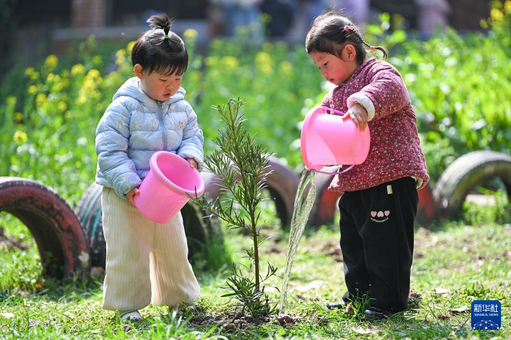 3月11日,江蘇省南京市建鄴區(qū)金地名京幼兒園的孩子們在校園里為樹苗澆水。