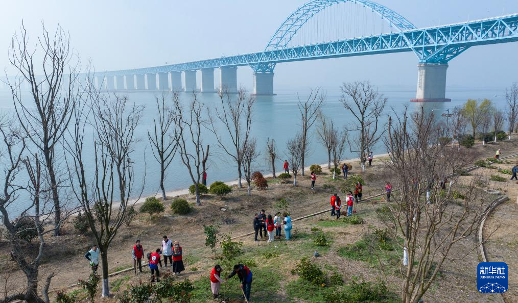 3月11日,在江蘇省南通市通州區(qū)平潮鎮(zhèn),志愿者在長江岸邊植樹(無人機照片)。
