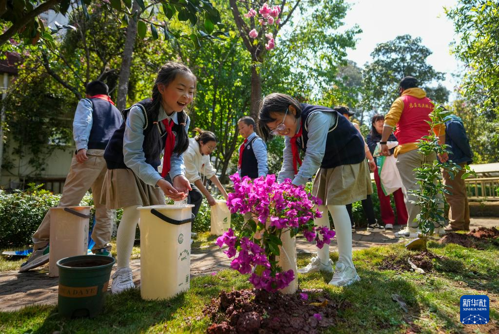 3月11日,在云南省昆明市盤龍區(qū)長青社區(qū),幾名小學生為剛種的三角梅澆水。