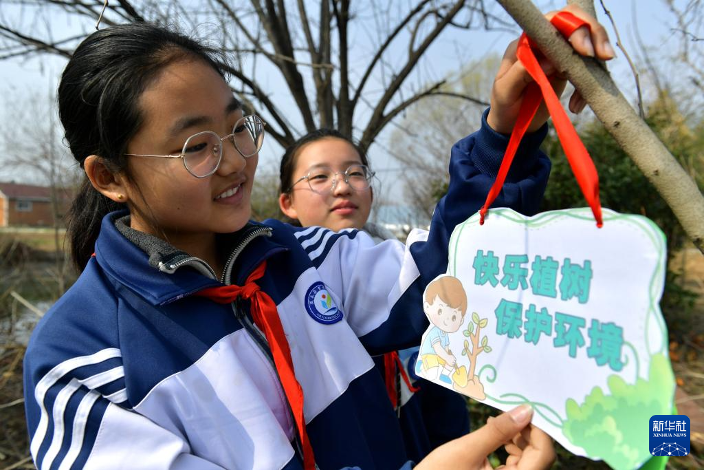 3月11日,小學生在河南省商丘市夏邑縣育才學校教育實踐基地參加義務植樹護樹活動。