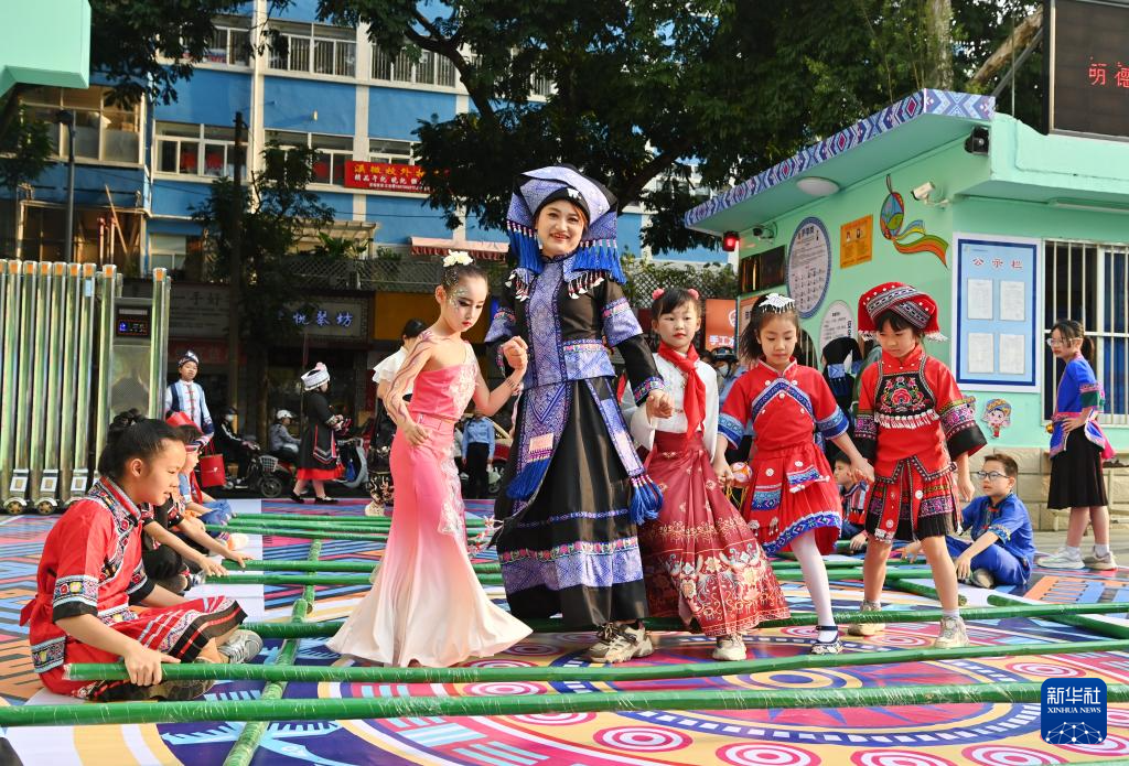 3月27日,老師和孩子們在廣西南寧市民族大道東段小學(xué)跳竹竿舞。