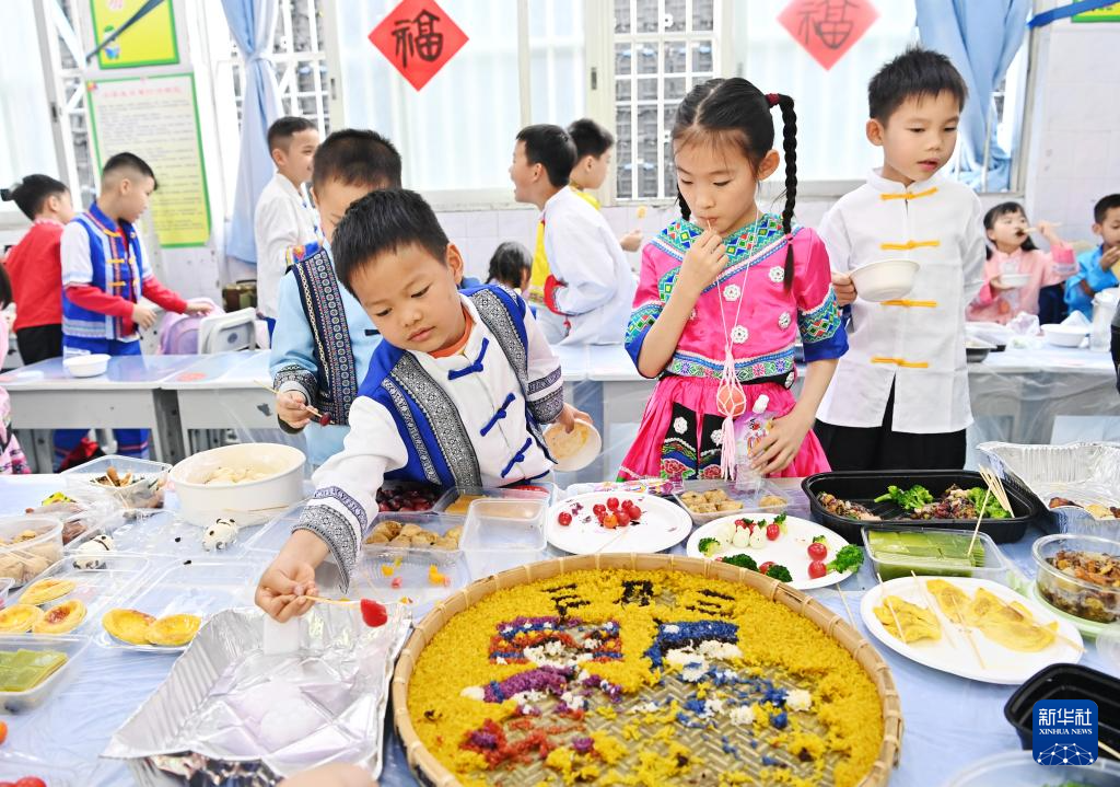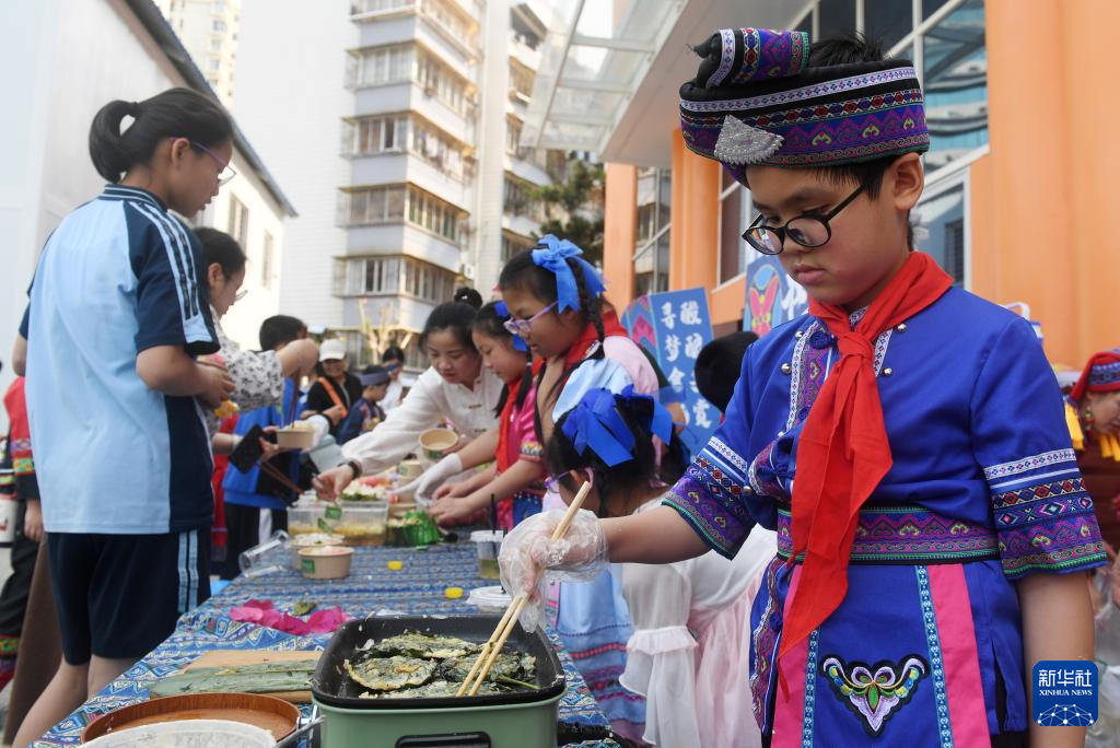 3月27日,孩子們在廣西南寧市民族大道東段小學(xué)品嘗傳統(tǒng)美食。