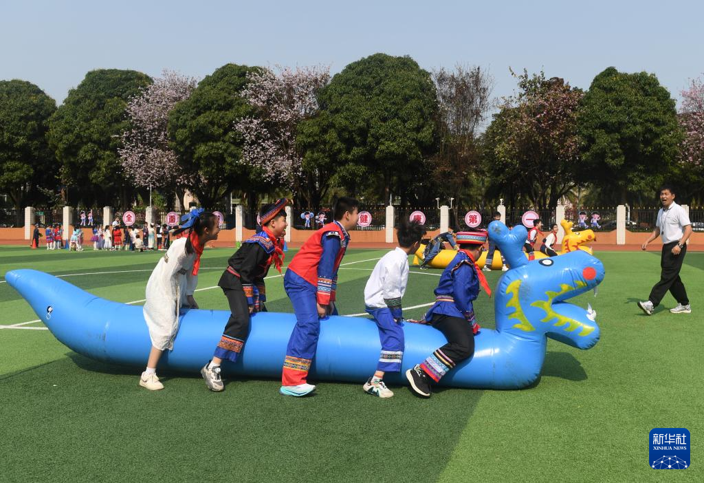 3月27日,在廣西南寧市濱湖路小學(xué),學(xué)生在開展旱地龍舟趣味賽。