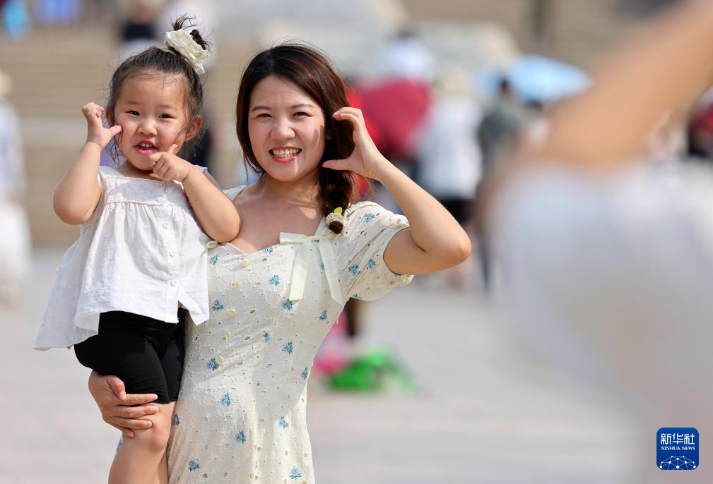 5月3日,家長帶著孩子在海南省三亞市南山文化旅游區(qū)游覽。