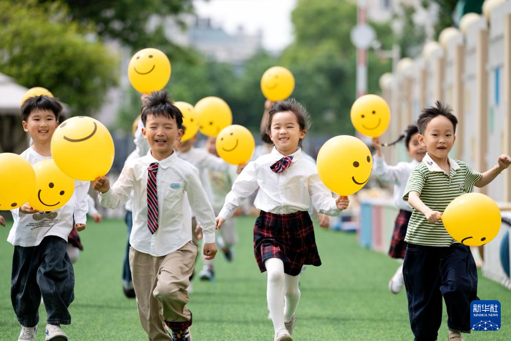 5月6日,浙江省湖州市長興縣實(shí)驗(yàn)幼兒園的孩子們手舉笑臉氣球,進(jìn)行“笑臉賽跑”小游戲。