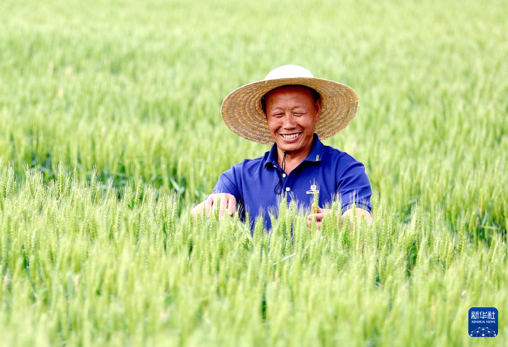 5月5日,山東省臨沂市郯城縣郯城街道陵坡村村民在田間查看小麥長勢。