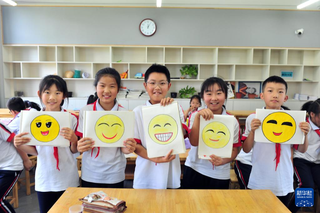 5月7日,湖北省宜昌市秭歸縣實(shí)驗(yàn)小學(xué)學(xué)生在美術(shù)課堂上展示自己創(chuàng)作的笑臉卡通美術(shù)作品。