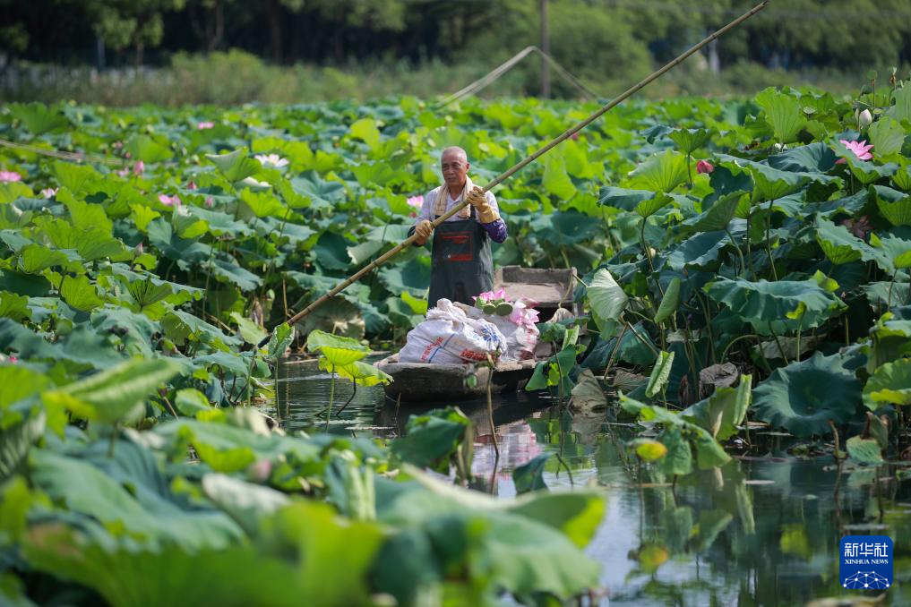 8月7日,農民在浙江省湖州市吳興區(qū)埭溪鎮(zhèn)官澤村采摘荷花和蓮蓬。