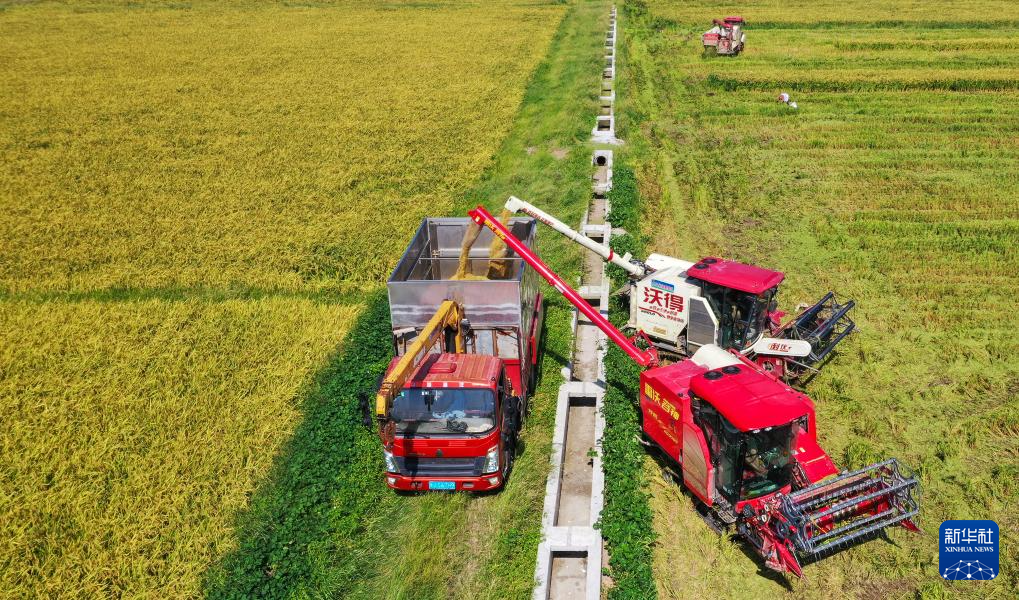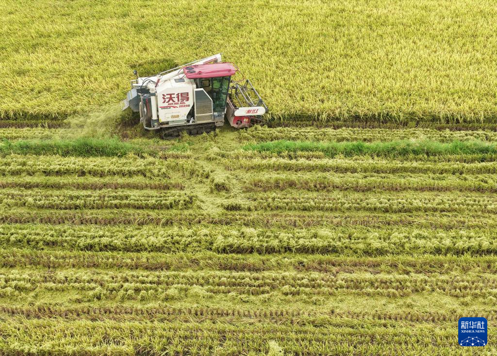 8月7日,在湖南省永州市道縣壽雁鎮(zhèn)社下村,農民駕駛農機收割水稻(無人機照片)。