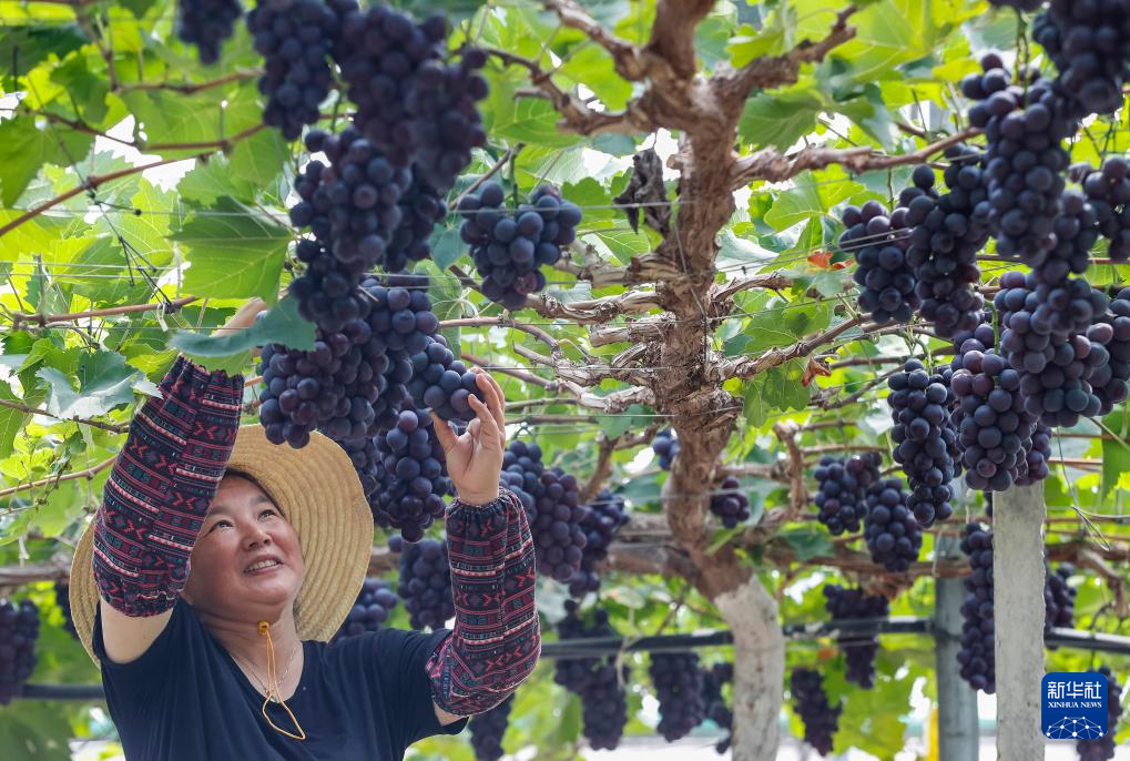 8月7日,果農在江蘇省句容市白兔鎮(zhèn)倪塘村一家葡萄園采摘葡萄。