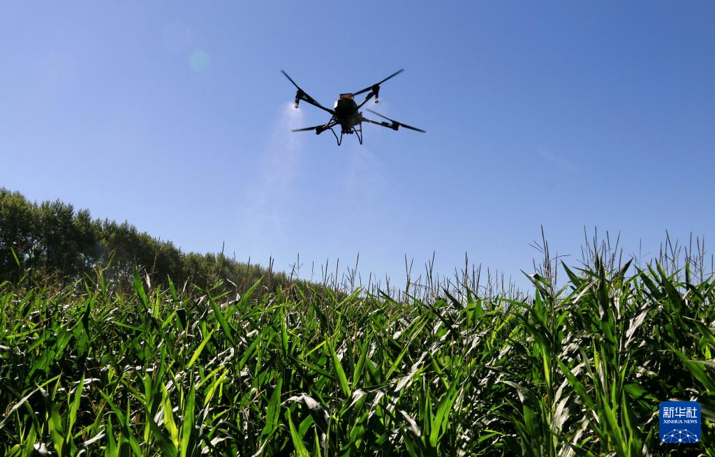 8月7日,在北大荒集團黑龍江格球山農場有限公司第二管理區(qū),一架植保無人機為玉米噴施“營養(yǎng)液”。