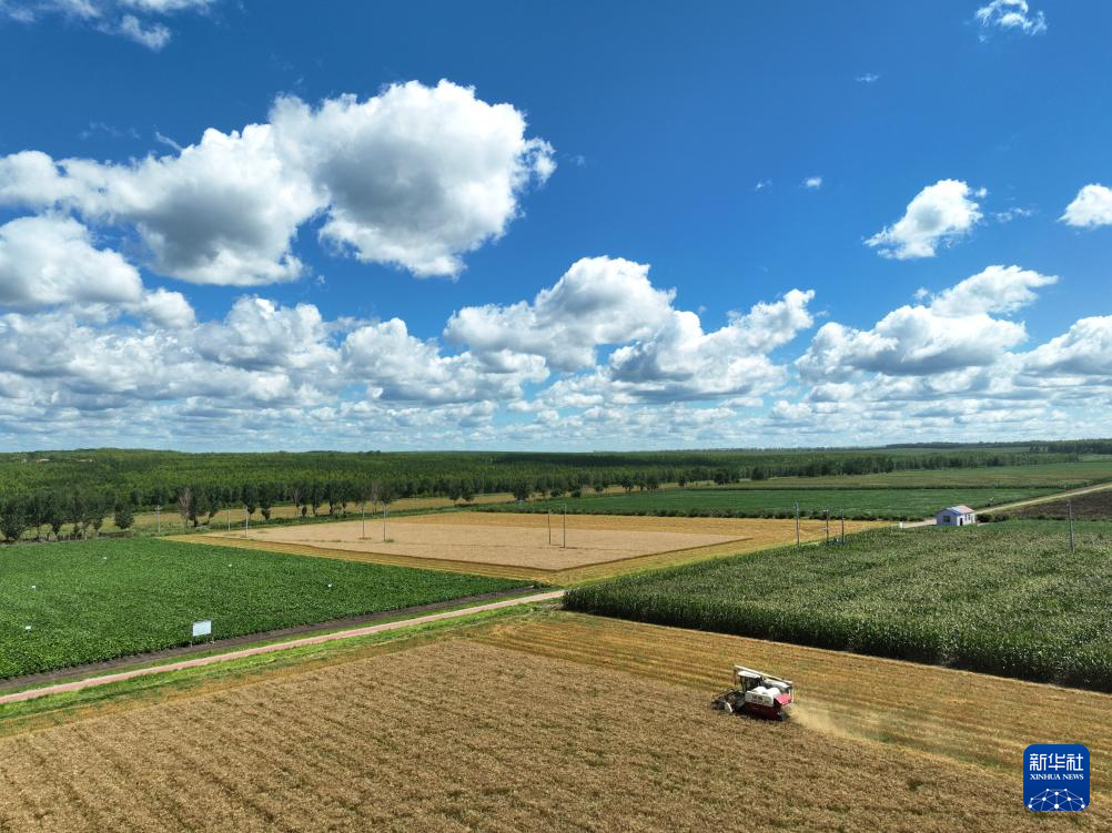 8月7日,在黑龍江省農墾科學院九三科創(chuàng)中心,一臺收割機在小麥繁殖田進行收獲作業(yè)(無人機照片)。