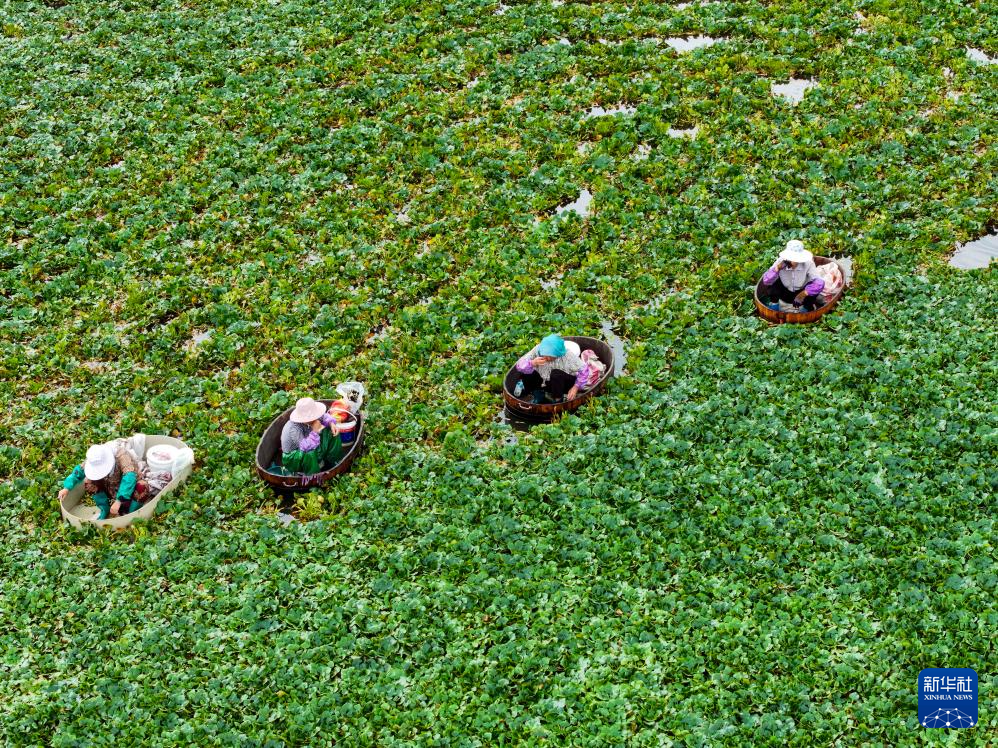 8月7日,江蘇省泰州市海陵區(qū)蘇陳鎮(zhèn)張家院社區(qū)農民在菱塘采摘菱角(無人機照片)。
