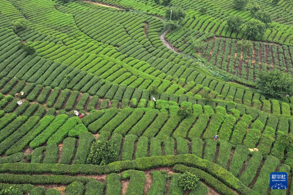 8月7日,茶農在三峽庫區(qū)湖北省宜昌市秭歸縣茅坪鎮(zhèn)松樹坳村一茶園采摘秋茶(無人機照片)。