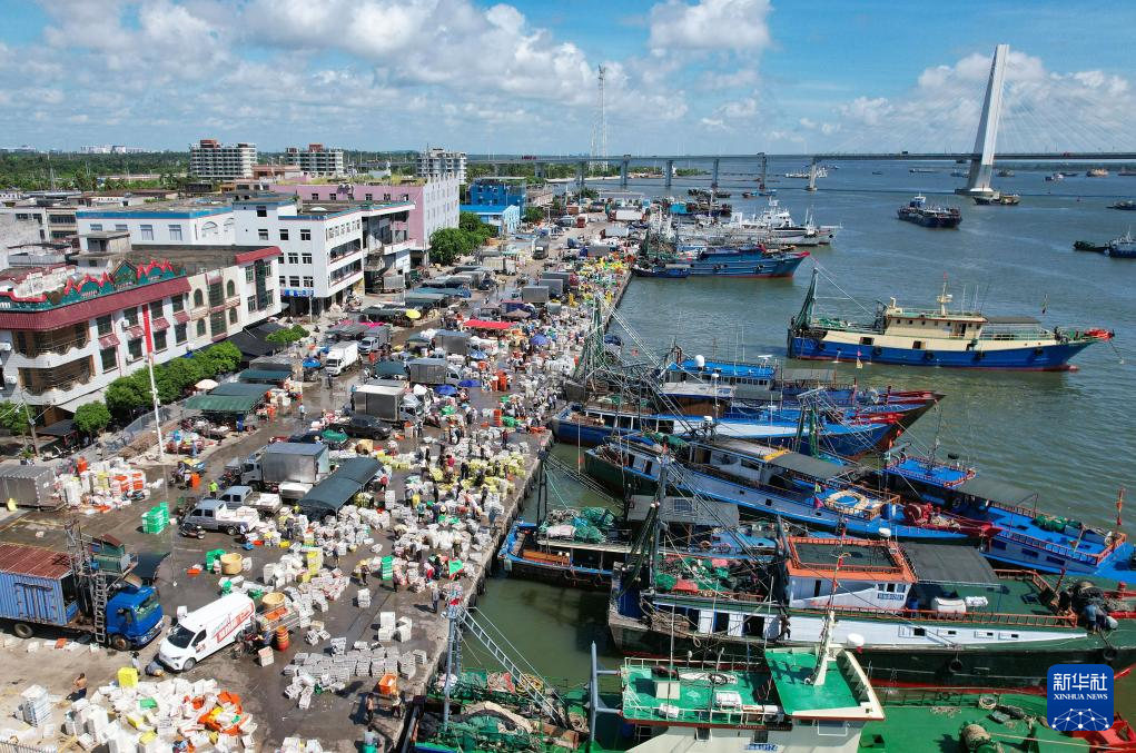 在海南省文昌市清瀾漁港碼頭,漁民和商販在卸貨、交易(8月21日攝,無人機照片)。