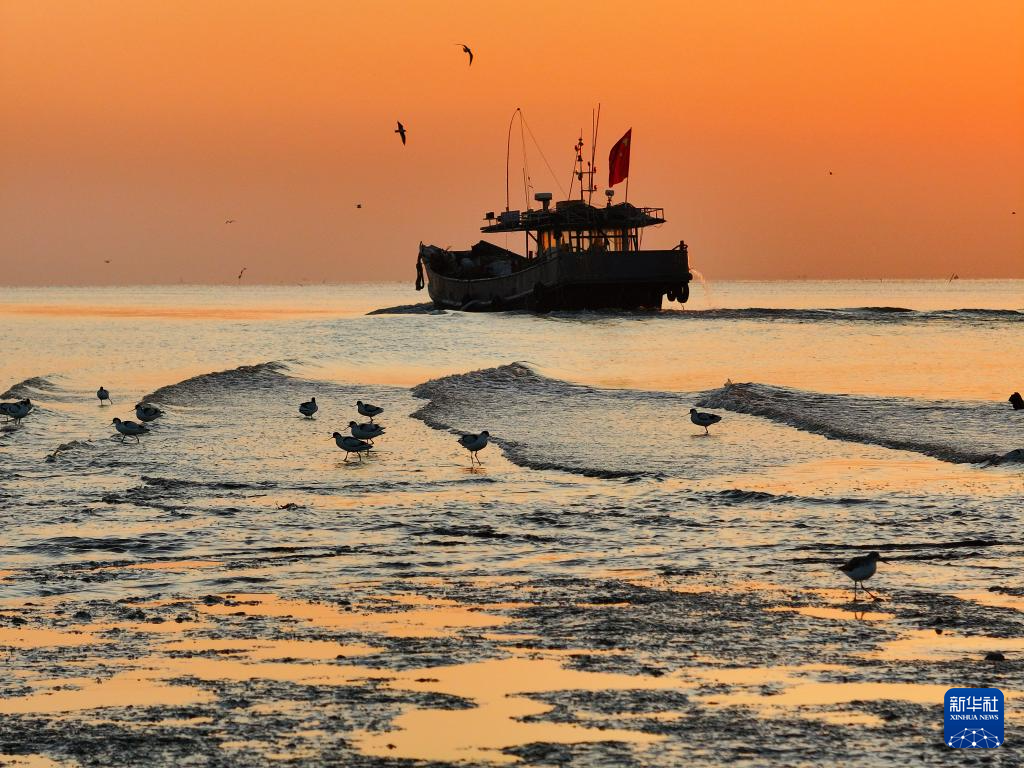 11月19日,海鳥在江蘇省連云港市贛榆區(qū)沿海濕地里覓食(無人機照片)。