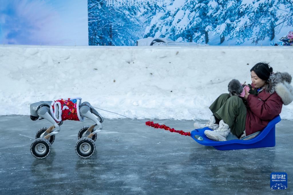 1月5日,游客在哈爾濱冰雪嘉年華園區(qū)乘坐機(jī)器人拉爬犁。